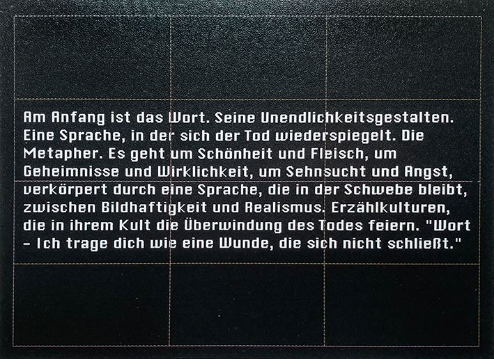 Parallel dazu entstanden Textcollagen aus Zeitungsartikeln, die in einem kleinen Flügelaltar präsentiert wurden. Es gab ein grundlegendes Gestaltungsraster, das allen Einzelmedien zu Grunde lag. Den Ölbildern, der Animation und natürlich dem Satzraster des begleitenden Buches. Alles zusammen war für einen festgelegten Präsentationsaufbau konzipiert.