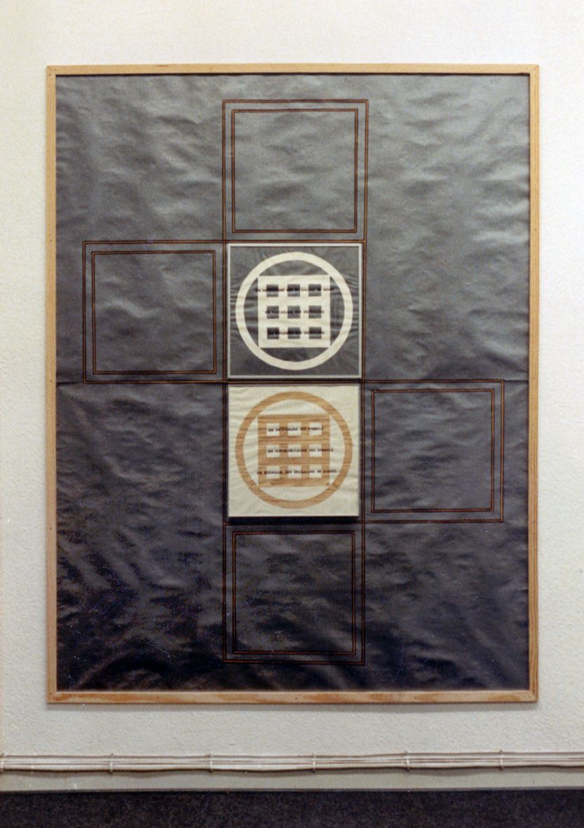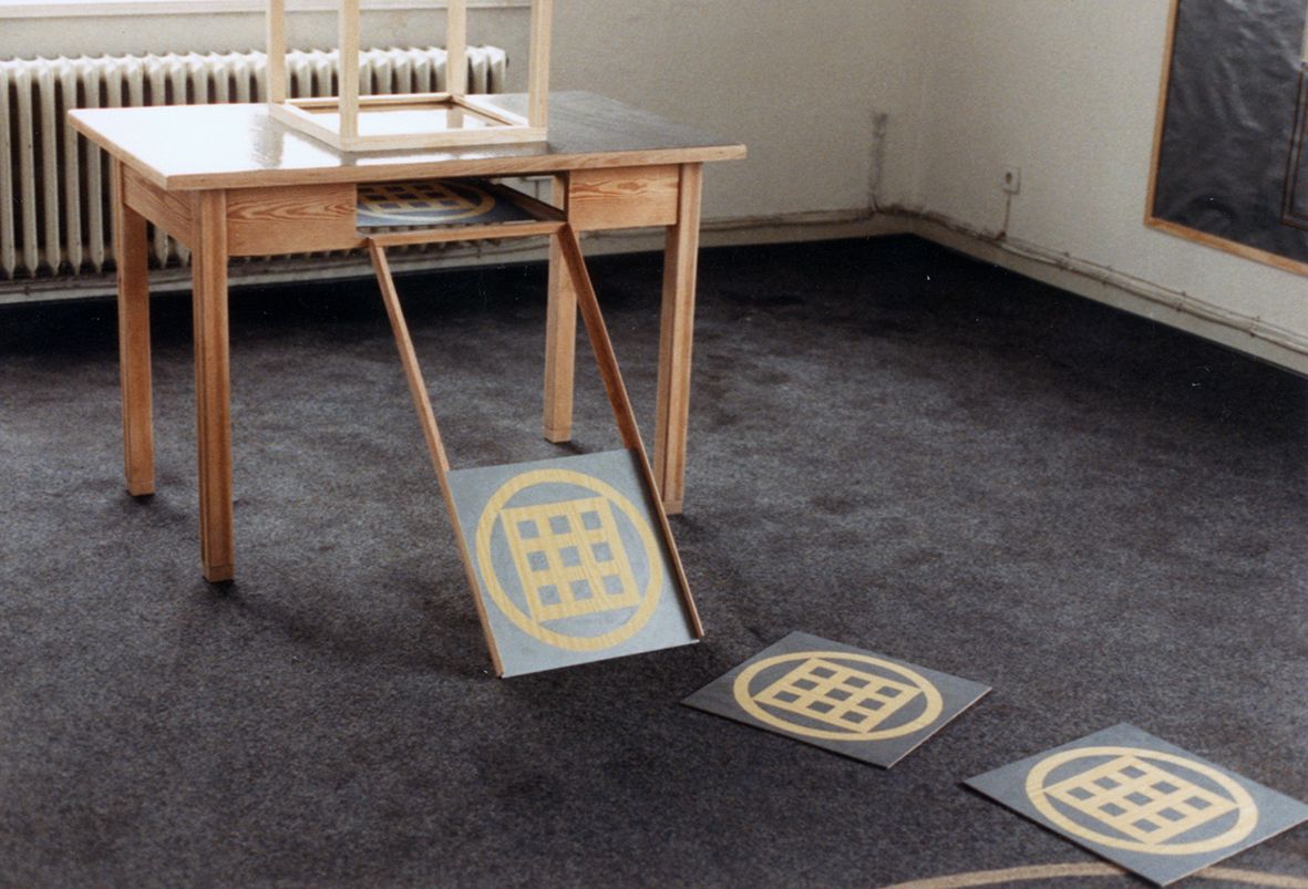 Die Installation „Zeichenproduktion“ referrierte auf den Produktionsprozeß der ehemailgen Büroräume, die nur die Sicht auf die Fabrik hatten, aber selbst keine Werkzeuge herstellten. Quasi nur abstrakt an der realen Werkzeugerstellung partizipierten und diese nur verwalteten. Auf Sichthöhe erblickte man drei quadratische Fenster, um die ich eine Art Symbol baute. Dieses Zeichen wurde dann erst auf einen Bürotisch "reflektiert", dann "reproduziert" und "vervielfältigt".