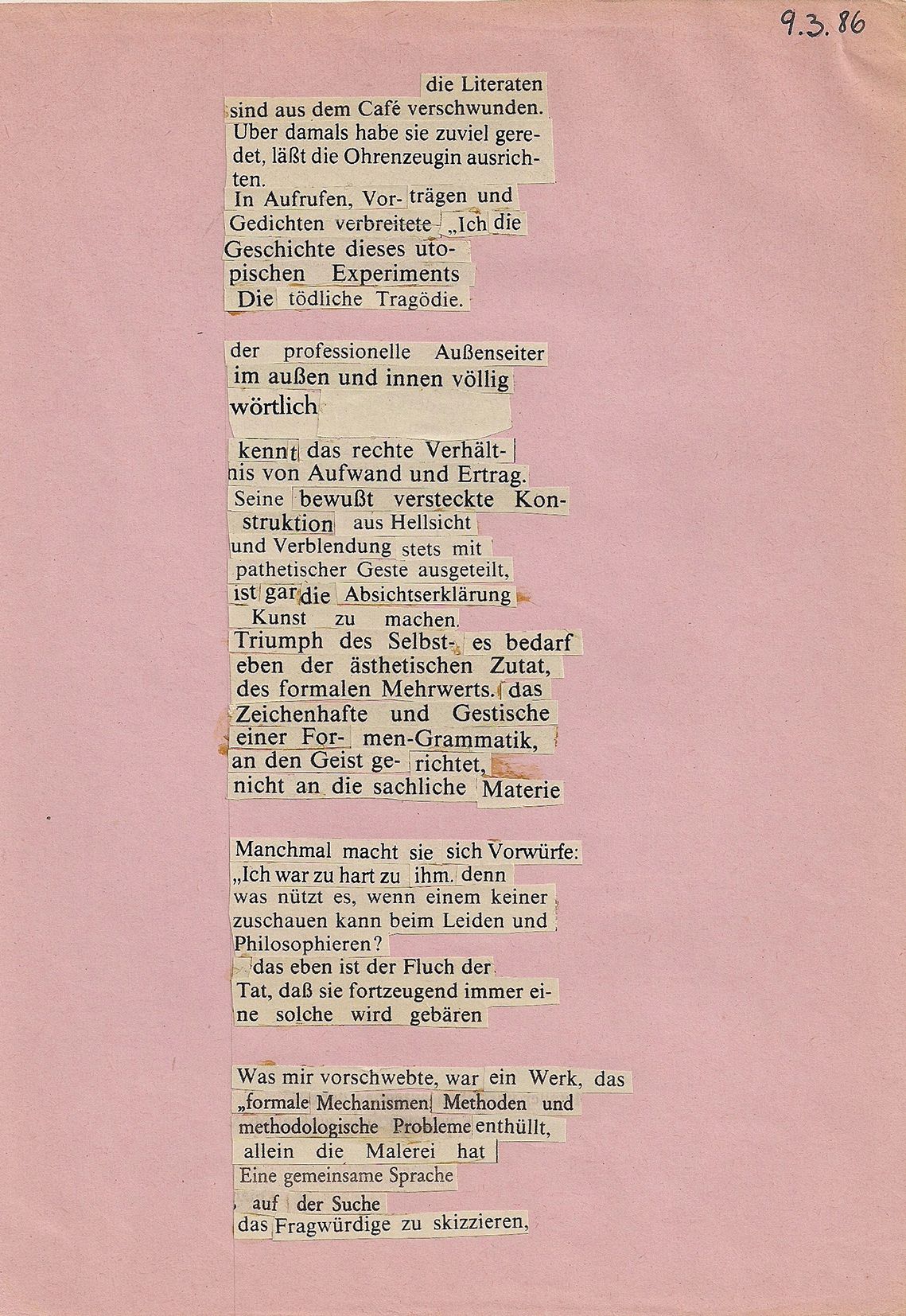 Meine Begeisterung für den Strukturalismus schlug sich irgendwann in Textcollagen nieder. "Der gesamte poetische Text ist ein ‚System von Systemen’, er verdichtet auf kleinstem Raum mehrere Systeme, deren jedes seine eigenen Spannungen, Parallelismen, Wiederholungen und Oppositionen beinhaltet, ...“(Jurij Lotman (russischer Strukturalist). Großartig.